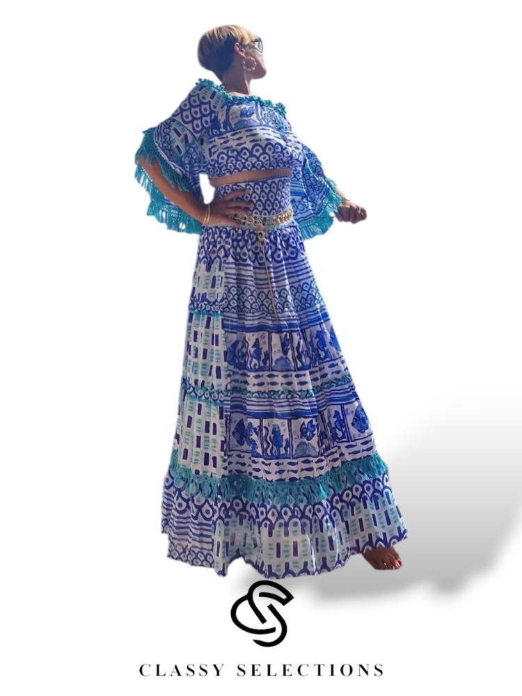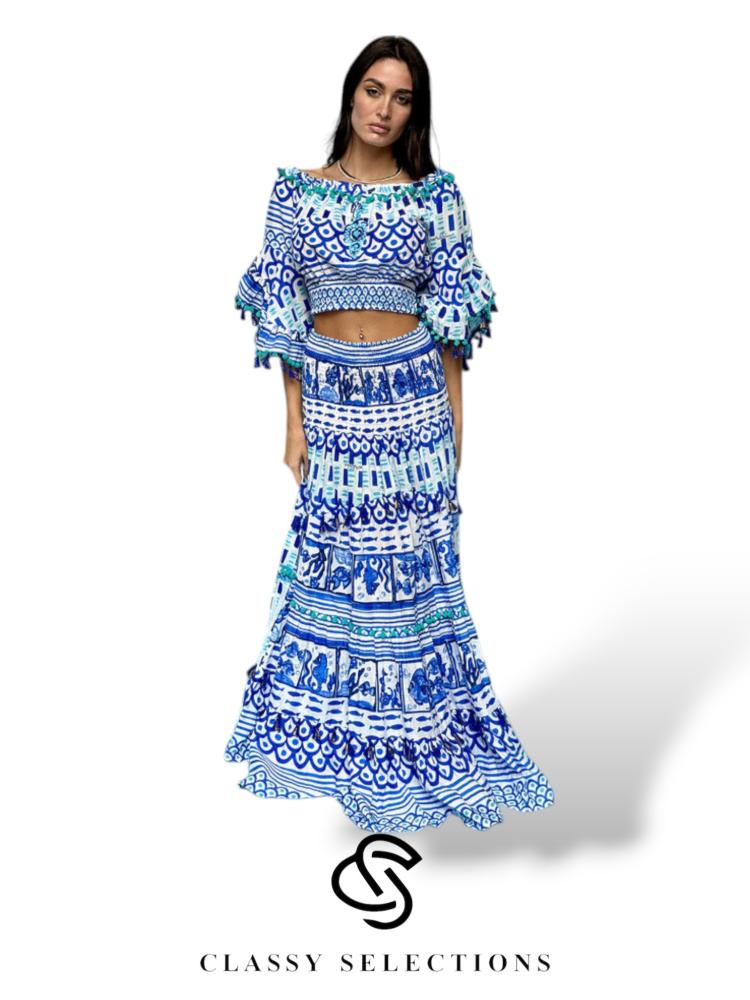 طقم صيفي بوهيمي فاخر من قطعتين، بتصميم مفعم بالحيوية والتفاصيل الفنية المستوحاة من أجواء البحر الأبيض المتوسط. يتكون من توب قصير بأكمام واسعة مزينة بكشكشة وياقة عريضة جذابة، مع تنورة طويلة بطبعات فنية متعددة الطبقات تضفي لمسة أنثوية جذابة.